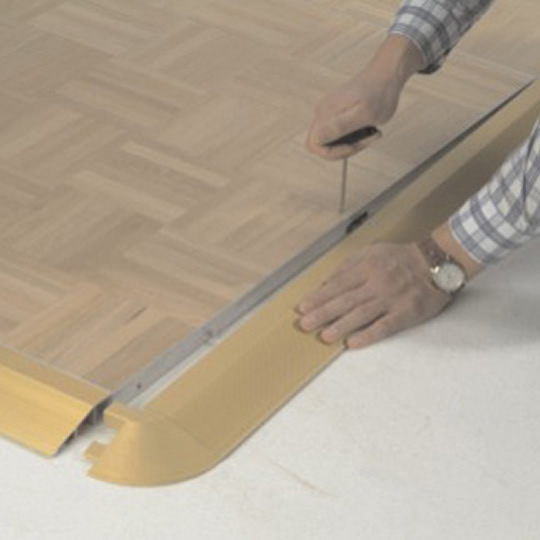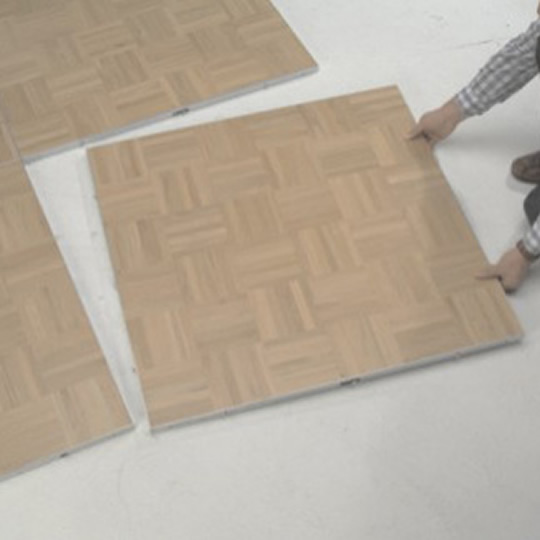 Die einzelnen Platten in der Abmessung 950x950x27 mm sind schnell und einfach montiert. Das Verbindungssystem ist wartungsfrei, ohne lose Teile und verleiht dem mobilen Boden extreme Stabilität sowie Belastbarkeit. Die abschließende, angewinkelte Einfassung aus eloxiertem Aluminium wird für den sicheren Zutritt ebenfalls verriegelt. Nach einer Veranstaltung kann die Fläche auf einem kompakten Transport- und Lagerwagen sicher und schnell verstaut werden. Die Tanzplatten sind in versiegeltem Eichenparkett oder Laminat erhältlich. Weitere Oberflächen sind möglich und auch für den Ausseneinsatz gibt es eine spezielle Lösung.